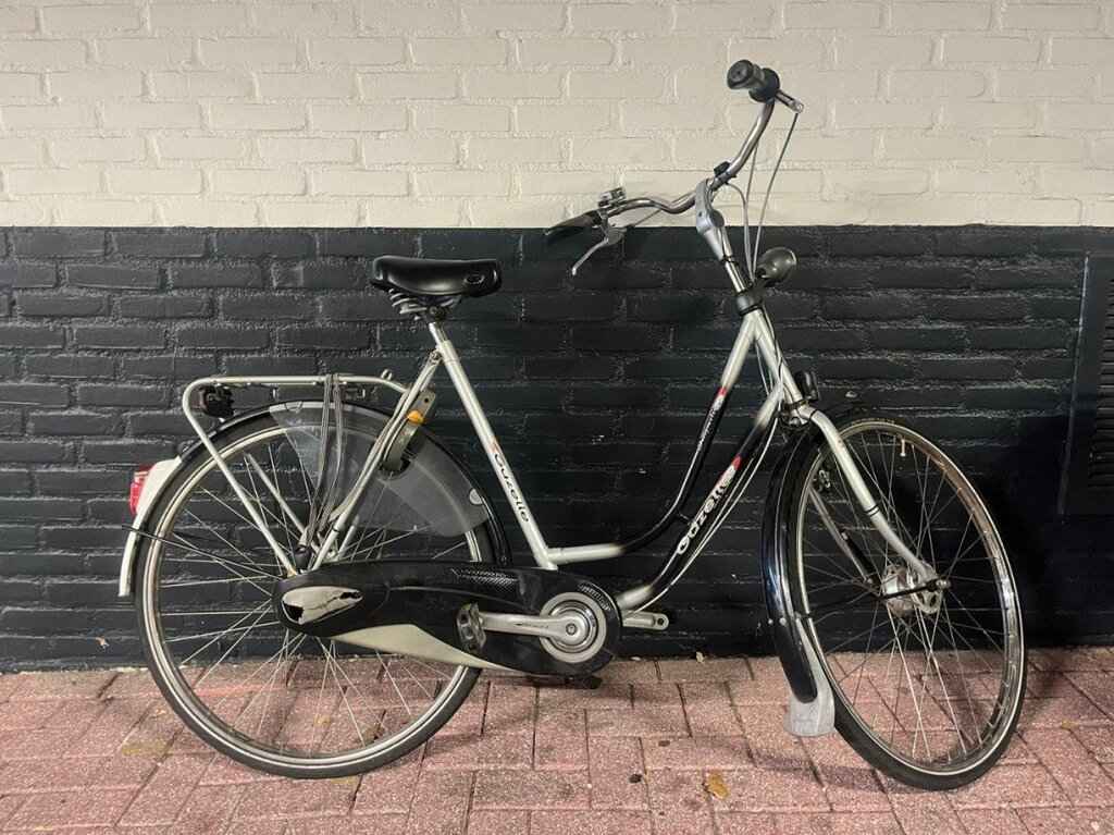 De fiets heeft het kenmerkende comfortabele Gazelle-zitcomfort en een tijdloze zilveren afwerking.