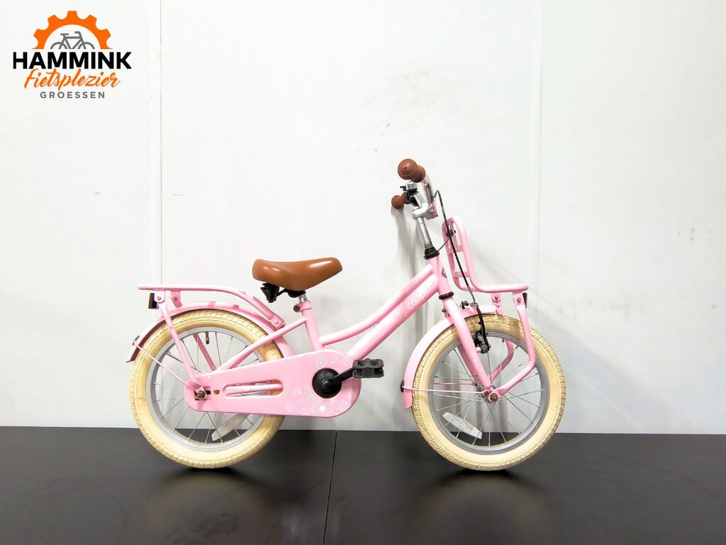 Een roze Popal Cooper 16 inch kinderfiets met terugtraprem. Deze fiets heeft 8 dagen omruilgarantie.