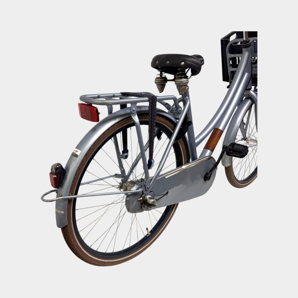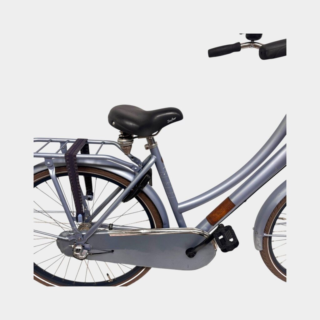 Cortina Transport U4 Mini Denim meisjesfiets in framemaat 26inch. Kleur: Nymp Blue Matt. Uitgerust met achter een Shimano Nexus 3-traps versnellingsnaaf met terugtraprem en voor een standaard naaf. Opvallende details: koperen velgen, koper rivets op zadel, lederen tags op frame en kettingkast, voordrager.