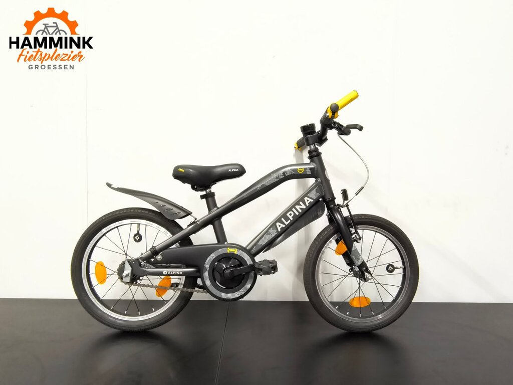 Tweedehands Alpina Trial 16 inch jongensfiets. Uitgerust met een handrem en een terugtraprem, aluminium frame met een hoogte van 26 cm. Je ontvangt 8 dagen omruilgarantie op deze fiets.
