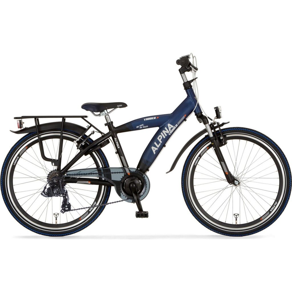 Alpina fiets Yabber Jongens, 26inch, Kleur: Sporty Blue Matt - Jet Black Metallic Matt. Uitgerust met V-Brakes voor en achter, Shimano derailleur met 7 versnellingen, verende vork, stickers onder de lak. Kleurnummers: RAL 5026 Met Matt / RAL 9005 Met Matt.