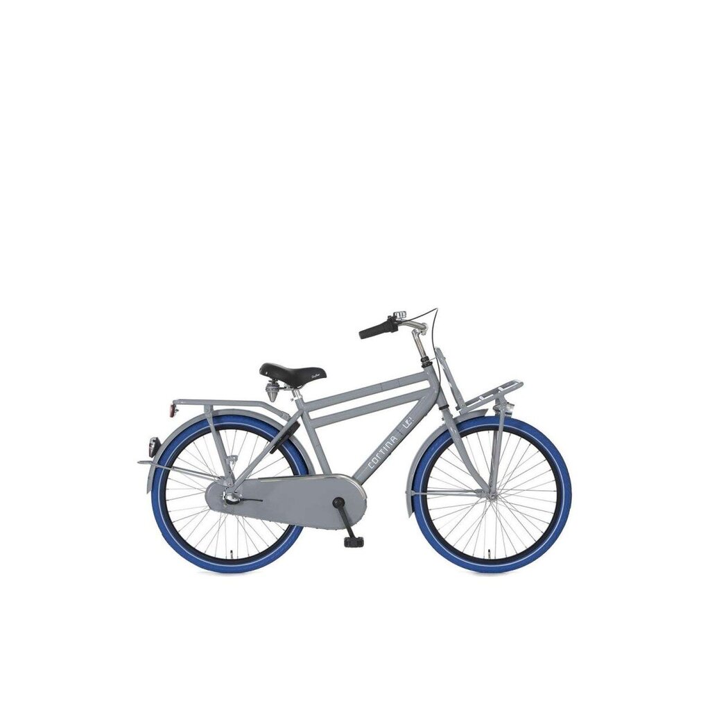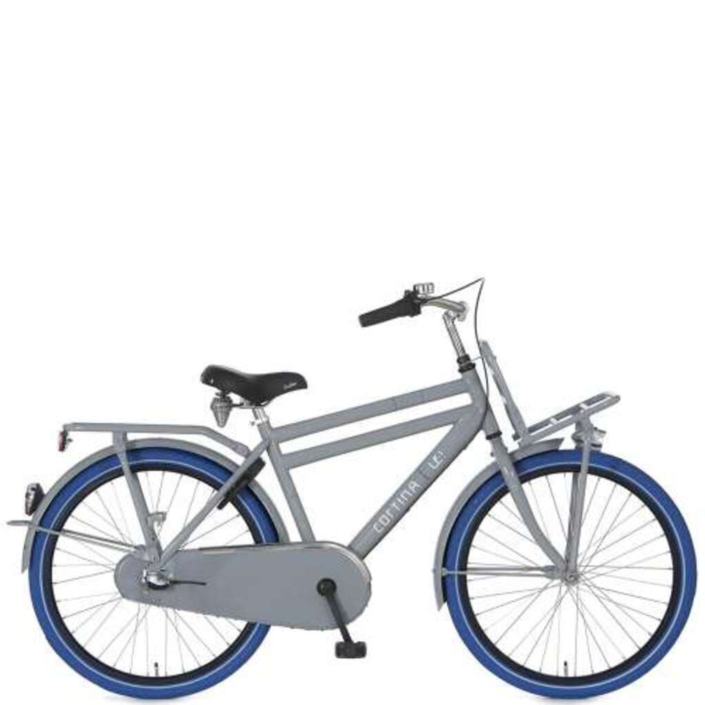 Cortina U4 Mini jongensfiets in framemaat 26inch. Kleur: Traffic Grey. Uitgerust met achter een Shimano Nexus 3-traps versnellingsnaaf met terugtraprem en voor een standaard naaf. Opvallende details: voordrager.
