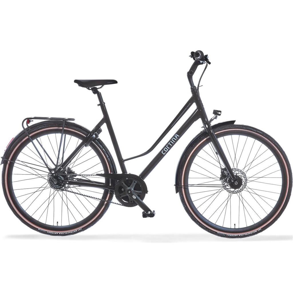 Cortina Mozzo damesfiets in framemaat 56cm. Kleur: Black Brown. Uitgerust met achter een Shimano Nexus 8-traps versnellingsnaaf met een hydraulische schijfrem en voor een Shimano naafdynamo met een hydraulische schijfrem. Opvallende details: aluminium frame, Gates beltdrive - type CDN en in spatbord geintegreerde achterverlichting. Kleurnummer: RAL 8022.