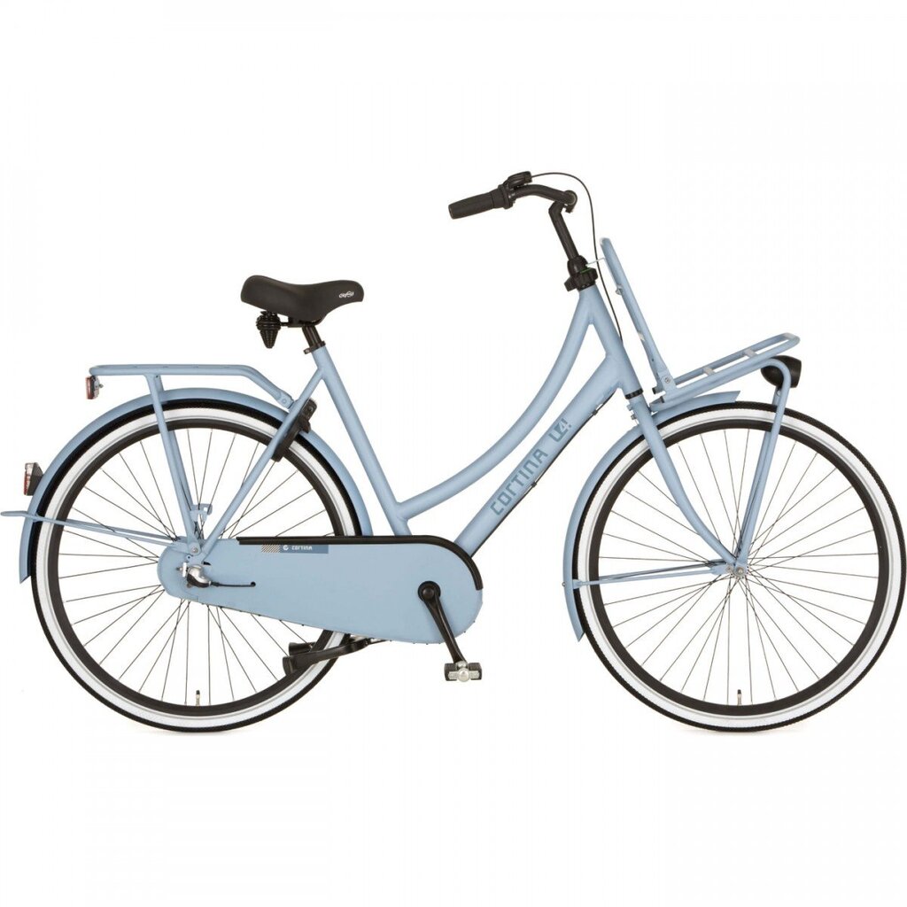 Cortina Transport U4 damesfiets in framemaat 57cm. Kleur: Blue Sky Metallic Matt. Uitgerust met achter een Shimano Nexus 3-traps versnellingsnaaf met terugtraprem en voor een standaard naaf. Opvallende details: aluminium frame, stuurslot, voordrager.