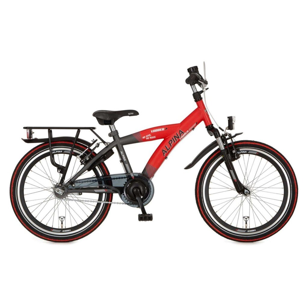 Alpina fiets Yabber Jongens, 20inch. Kleur: Traffic Red Matt - Industrial Black Matt. Uitgerust met V-brakes voor en achter en achter een remnaaf, aluminium frame. Kleurnummers: RAL 3020 C Met Matt / PMS 10393 C Met Matt.