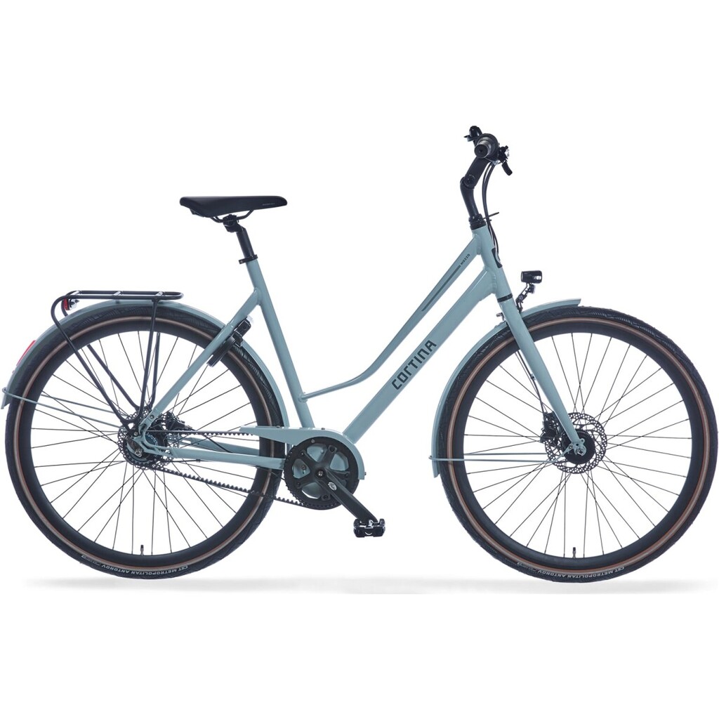 Cortina Mozzo damesfiets in framemaat 51cm. Kleur: Sea Grass. Uitgerust met achter een Shimano Nexus 8-traps versnellingsnaaf met een hydraulische schijfrem en voor een Shimano naafdynamo met een hydraulische schijfrem. Opvallende details: aluminium frame, Gates : beltdrive - type CDN en in spatbord geintegreerde achterverlichting. Kleurnummer: UGSW 84581.