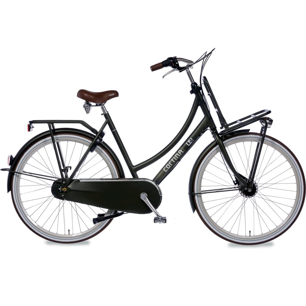 Cortina Transport U4 damesfiets in framemaat 61cm. Kleur: Elegance Green Matt. Uitgerust met achter een Shimano Nexus 7-traps versnellingsnaaf met rollerbrake en voor een Shimano naafdynamo met rollerbrake. Opvallende details: aluminium frame, stuurslot, voordrager. Kleurnummer: PGRW 09539 Matt.