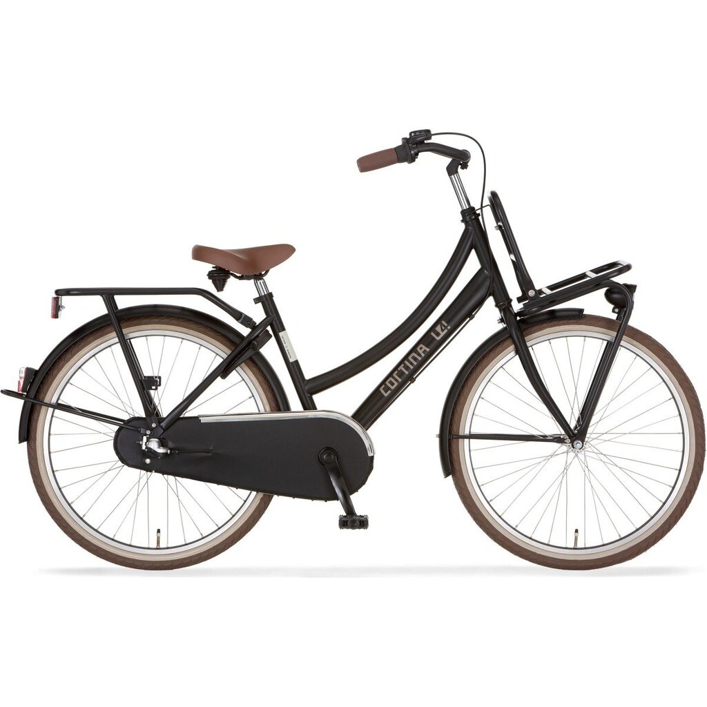 Cortina Transport U4 Mini meisjesfiets in framemaat 24inch. Kleur: Jet Black Matte. Uitgerust met achter een Shimano Nexus 3-traps versnellingsnaaf met terugtraprem en voor een standaardnaaf. Opvallende details: voordrager.