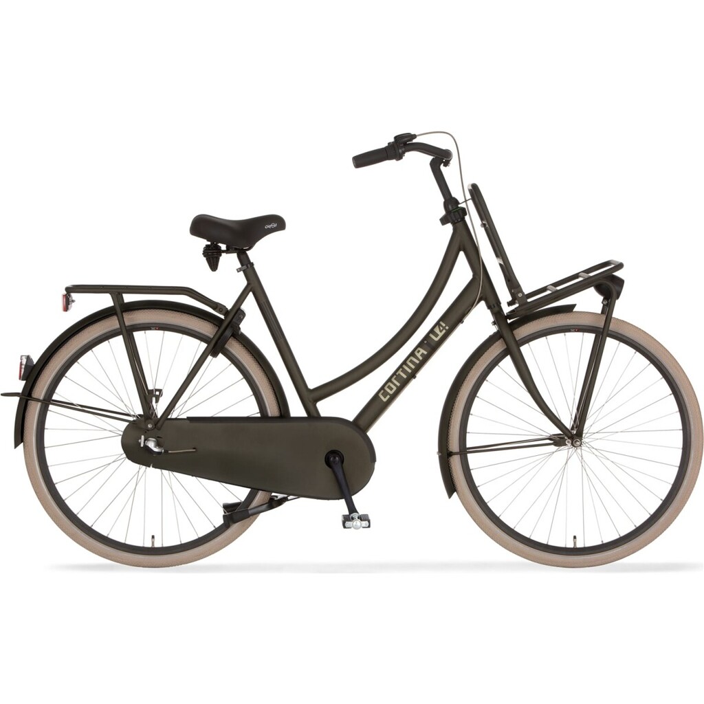 Cortina Transport U4 damesfiets in framemaat 50cm. Kleur: Elegance Green matt. Uitgerust met achter een Shimano Nexus 3-traps versnellingsnaaf met terugtraprem en voor een standaard naaf. Opvallende details: aluminium frame, stuurslot, voordrager.