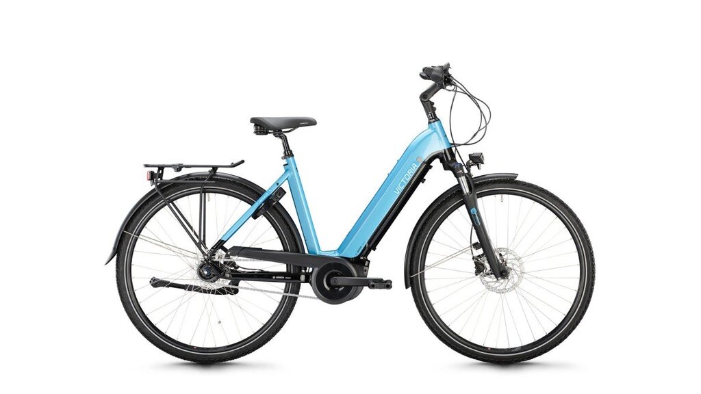 VICTORIA Elektro-Trekkingrad "TRESALO 11" (#1), 28", aqua blue ¦ De TRESALO 11 is het opstapmodel naar de wereld van de 'Bosch Power Tube' accu's. Hij is uitgerust met de Bosch 'Active Line Plus' middenmotor, die met 50 Nm koppel stil en soepel ondersteunt. Met zijn capaciteit van 500 Wh is de volledig geïntegreerde frameaccu voldoende voor zowel uitgebreide dagtours over het platteland als voor ritten dwars door de stad. De onderhoudsarme Shimano 'Nexus' versnellingsnaaf met vrijloop ondersteunt met zijn zeven versnellingen en kan bij efficiënt gebruik het bereik van de E-bike beïnvloeden. Maar de TRESALO 11 heeft niet alleen power, ook het comfort waar het merk Victoria voor staat komt bij de uitrusting niets tekort. Allereerst is er de verende Suntour voorvork, die met zijn 63 mm veerweg oneffenheden in de grond gladstrijkt, maar die ook kan worden geblokkeerd bij gladde stukken van de tocht. Verder is er de geveerde zadelpen, in combinatie met het ergonomische stuur en de Wing handvatten. De verlichting, bestaande uit een LED koplamp en achterlicht, maakt de E-bike geschikt voor gebruik in het verkeer. Stevige aluminium spatborden zorgen ervoor dat opstuivend vuil niet op de broekspijpen terechtkomt. De bagagedrager met het MIK-systeem maakt de ware allrounder TRESALO 11 compleet. Tassen en manden die over een klik-mechanisme beschikken, kunnen snel en zonder gereedschap worden ingeklikt.