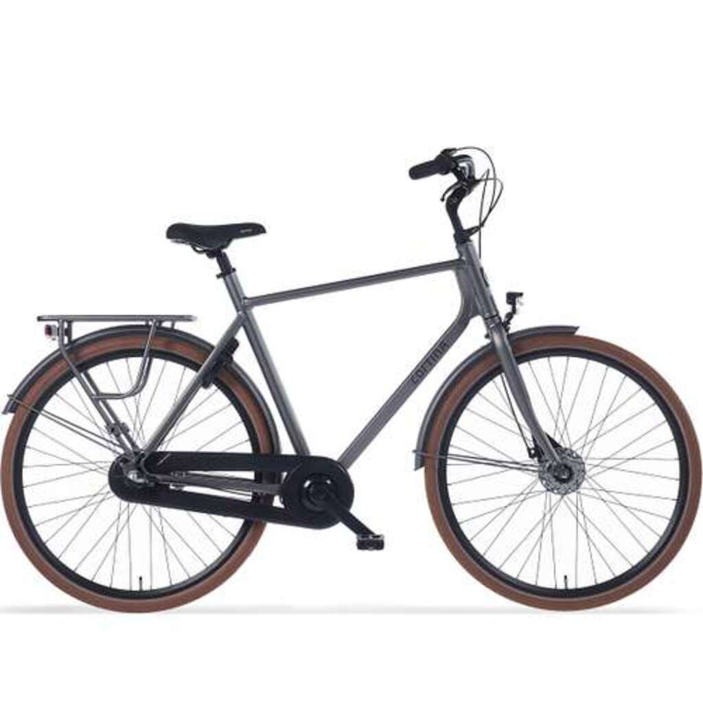 Cortina Foss herenfiets in framemaat 61cm. Kleur: Lead Metal Matt. Uitgerust met achter een Shimano Nexus 3-traps versnellingsnaaf met rollerbrake en voor een Shimano naafdynamo met rollerbrake. 09000-10435 Matt