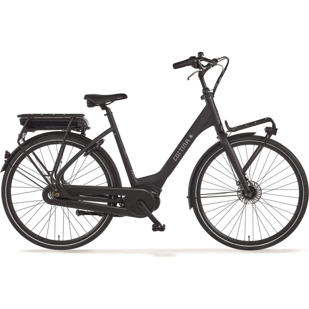 Cortina elektrische fiets Common Dames 61cm, kleur: Jet Black Matt. Uitgerust met een Shimano Nexus 7 versnellingsnaaf, rollerbrakes voor en achter, Bosch ActiveLine systeem met middenmotor, wordt geleverd ZONDER accu en acculader. Kleurnummer: UZZ 69005 Matt.