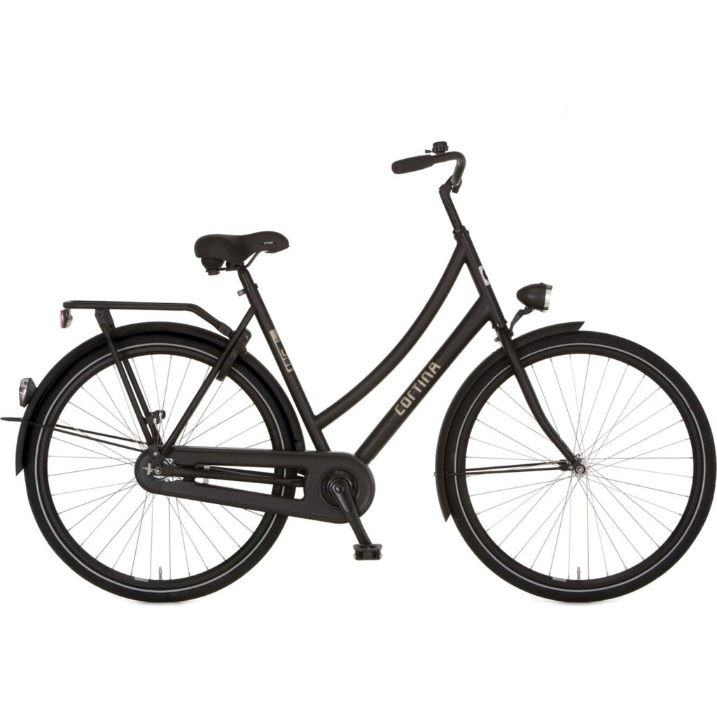 Cortina U1 damesfiets in framemaat 53cm. Kleur: Black Matte. Uitgerust met achter een Shimano naaf met terugtraprem en voor een standaard naaf.