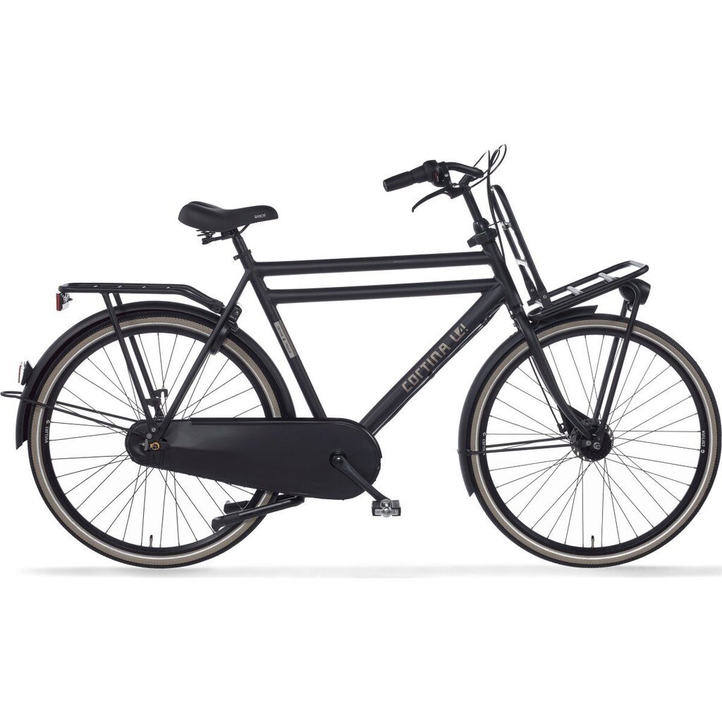 Cortina Transport U4 herenfiets in framemaat 61cm. Kleur: Jet Black Matte. Uitgerust met achter een Shimano Nexus 7-traps versnellingsnaaf met rollerbrake en voor een Shimano naafdynamo met rollerbrake. Opvallende details: aluminium frame, stuurslot, voordrager. Kleurnummer: UZZ 69005 Matte.