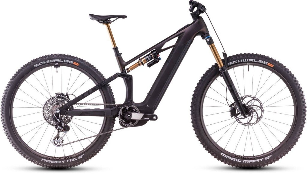 Compromisloze prestaties vragen om een compromisloze aanpak. Bosch CX dus, inclusief een geïntegreerde 800 Wh-accu. Maar op de Stereo Hybrid ONE44 HPC SLT 800 gaan we met de elektronische integratie nog een stap verder: Srams draadloos bedienbare 12-speed XX Eagle Transmission met carbon cranks van Race Face. Veerelementen van Fox, met een 150 millimeter Float 26 Factory X2-voorvork en een 140 millimeter Float X Factory-schokdemper, leveren tractie en controle, daarbij ondersteund door het gripzekere bandenduo Magic Mary en Big Betty van Schwalbe. Ook de Fox Transfer-dropperpost komt uit de Factory-serie. Lichte maar sterke carbon Phase 30-wielen van Newmen zorgen voor razendsnel accelereren en vlijmscherp sturen. Krachtige Magura Gustav Pro-remmen, tot slot, nemen effectief het vertragen voor hun rekening. Volledig compromisloos voor maximale prestaties.