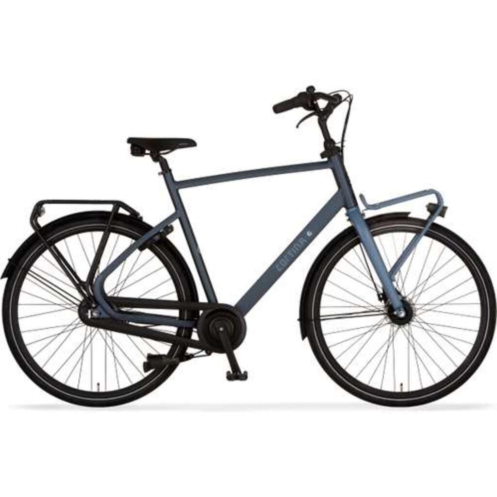 Cortina Common herenfiets in framemaat 61cm. Kleur: Mystery Grey Matt. Uitgerust met achter een Shimano Nexus 7-traps versnellingsnaaf met rollerbrake en voor een Shimano naafdynamo met rollerbrake. Opvallende details: aluminium frame, stuurslot en voorvork en voordrager in de kleur Dark Blue Matt. Kleurnummer: PGSG 99809 Matt (frame) / UBLW 62015 Matt (voordrager, voorvork).
