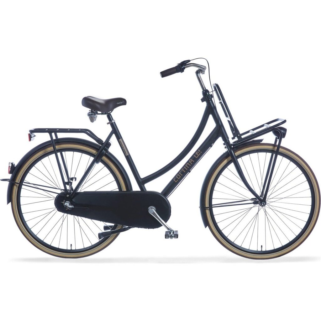 Cortina Transport U4 damesfiets in framemaat 57cm. Kleur: Jet Black Matte. Uitgerust met achter een Shimano Nexus 3-traps versnellingsnaaf met terugtraprem en voor een standaard naaf. Opvallende details: aluminium frame, stuurslot, voordrager.