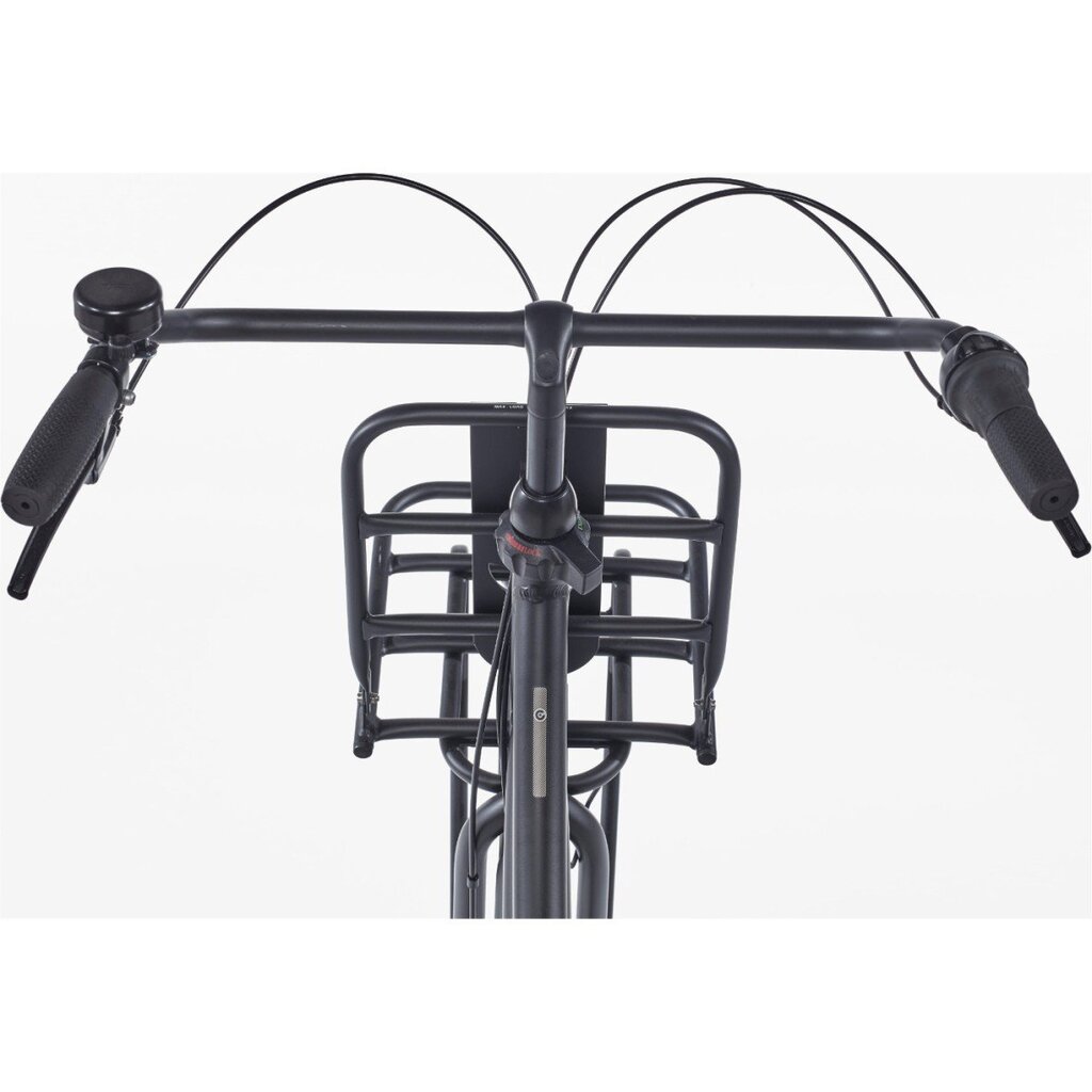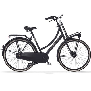 Cortina Transport U4 damesfiets in framemaat 57cm. Kleur: Jet Black Matte. Uitgerust met achter een Shimano Nexus 7-traps versnellingsnaaf met rollerbrake en voor een Shimano naafdynamo met rollerbrake. Opvallende details: aluminium frame, stuurslot, voordrager. Kleurnummer: UZZ 69005 Matte.