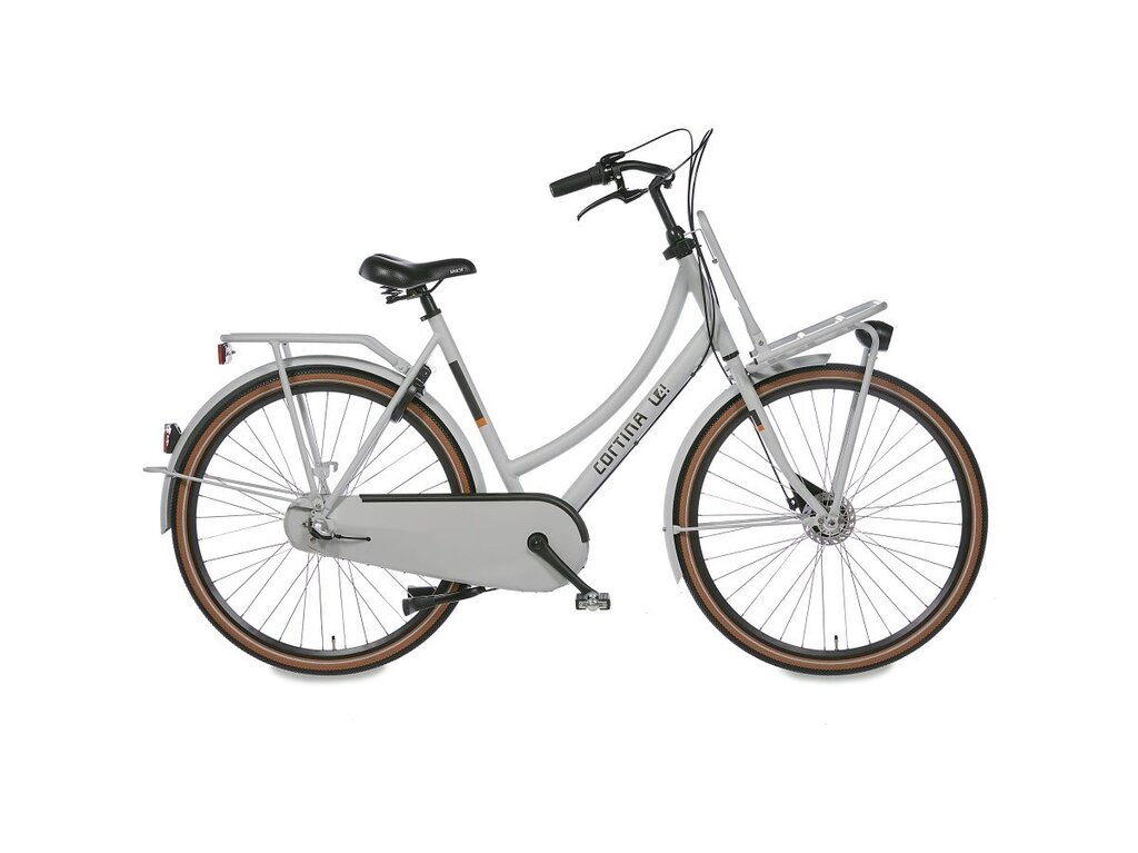 Cortina Transport U4 Solid damesfiets in framemaat 57cm. Kleur: Smooth Grey Matt. Uitgerust met achter een Shimano Nexus 3-traps versnellingsnaaf met rollerbrakes voor en achter. Opvallende details: aluminium frame, stuurslot, voordrager. Kleurnummer: UGSW 90040 Matt.